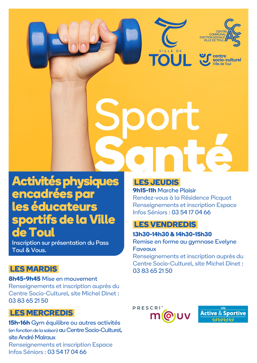 La ville de Toul propose des créneaux labellisé Prescri’mouv organisés par le Centre Socio Culturel et l’Espace Infos Séniors. Ils sont encadrés par les Educateurs Sportifs de la Ville formé par le dispositif.
