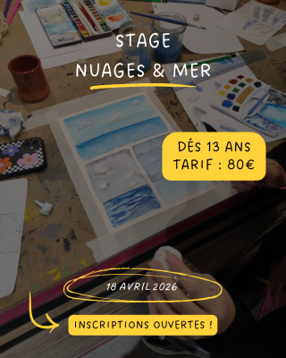 L’association CREW 333 avec l’artiste plasticien Matthieu Exposito vous propose un stage sur le thème Nuage et mer où vous découvrirai des technique pour illustrer la nature. Jouez avec la transparence, la lumière et les nuances de l’aquarelle ! En solo ou en famille, profitez d’un moment de création douce et colorée dans un atelier inspirant. Technique Aquarelle ou gouache. Matériel compris.